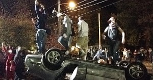 WMUR-TV in Manchester showed video of a crowd overturning a car, people running from tear gas clouds, street signs being torn down and fires burning in the streets. Police also investigated reports of people throwing glass bottles and fireworks, jumping off a roof and banging on cars.