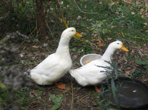 There they were, two lovely, bright white Pekin ducks. Each was timid, not sure what they would find as they exited the carriers, but they knew they wanted out. They were surprisingly quiet as I drove them to their new home from their previous home.
