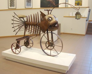 There’s nowhere near enough room in this review to cover all of the artists in this show. But there is one I need to close with, that prolific comic genius of rusted metal, Nathan Nicholls of Waldoboro, who died quite unexpectedly on July 11. His work is very popular. Probably most of us have seen some of it at one time or another, either in various displays or in photographs, and some of it already resides in museums. He has two pieces in this show—“Seahorse,” rising about seven feet off the floor, made from a snowmobile muffler, horseshoes, hammer head, and woodstove top—and the even more comic and creative “Angler Fish” likeness of that deep-sea creature who hunts with a little light suspended in an arch rising from its forehead. This piece rises like a tricycle, its body built from a bicycle seat, rebar, garden forks, pick heads, propane tank, rake tines, and electric lights for its eyes. May Nathan Nicholls’ rust rise into a treasure filling many more museums.