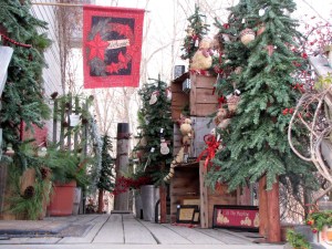 Erica Harris arranges decorative snowmen among the greens on the deck of Divine Inspirations Tuesday afternoon on Front Street in Farmington. because there are so many holiday items, the snowmen are displayed outside, she said of the festive holiday entrance to the shop.