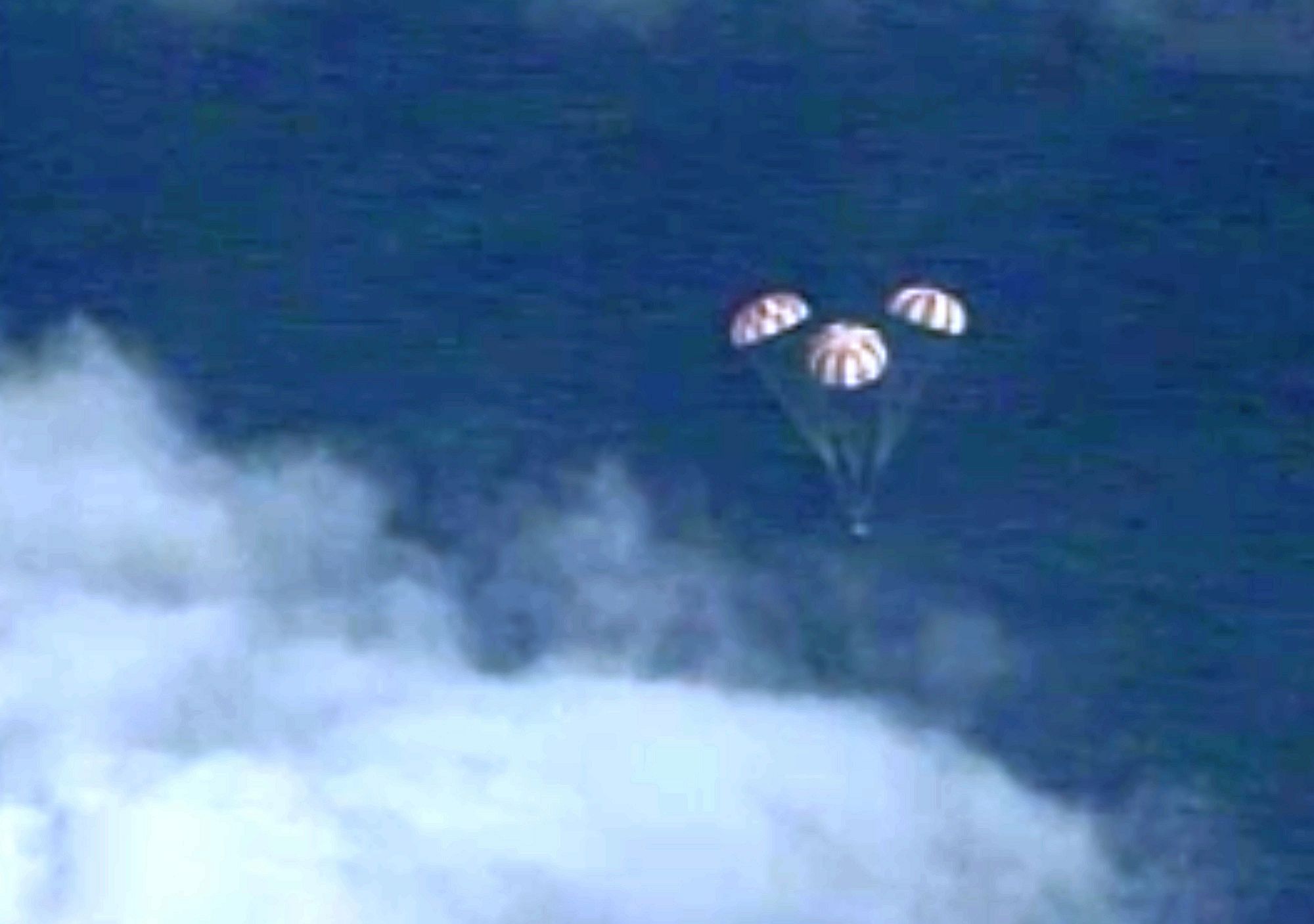 Earth shrank from view through Orion’s capsule window during its trip out to space, and stunning images were relayed back home. Its return was recorded by an unmanned drone flying over the recovery zone, providing more spectacular views. Helicopters then relayed images of the crew module bobbing in the water. Three of the five air bags deployed properly, enough to keep the capsule floating upright.