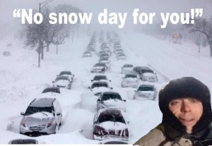 The picture is a graphic with Webster’s face — complete with a heavy snow hat — in the foreground and lines of snowed-in vehicles on a highway in the background.