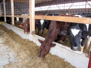 Instead of being tied in stalls, cows are housed in open pens on both sides of the structure and eat from a feed alley stretching down the middle. The bedded pack on which they rest is part of a compost process.