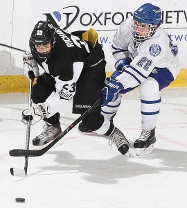 The latest installment of the Lewiston High School/St. Dominic Academy rivalry went the way of the Saints on Saturday night. Labrie netted a hat trick in the second period as St. Dom’s skated to a 5-2 victory over the Blue Devils at the Androscoggin Bank Colisee.