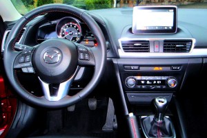 The controls are well placed for easy access and include redundant audio and communications controls in addition to the cruise controls on the face of the meaty steering wheel. Like many of the premium brands, the Mazda3 also has a bank of buttons and a large knob on the center console to the rear of the shifter. This grouping operates the navigation, audio as well as other vehicle functions with simple, intuitive menus shown on the seven-inch screen (plus it’s a touch screen) that’s mounted on the dash above the center stack. The system includes Mazda’s new human-machine interface system, which makes using the system easier and requires less driver concentration to use.