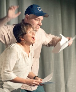 It’s a great concept with wonderful dialogue. But the four actors — two men, two women — selected at random to perform, had all of two minutes to examine the script and prepare to act while audience members prepared to let them have it.