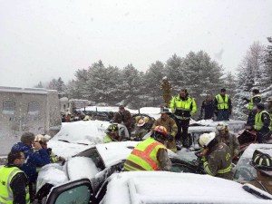 ETNA — More than 70 vehicles got tangled up in a series of chain-reaction pileups Wednesday along a snowy stretch of Interstate 95 in Maine, injuring at least 17 people, state police said.
