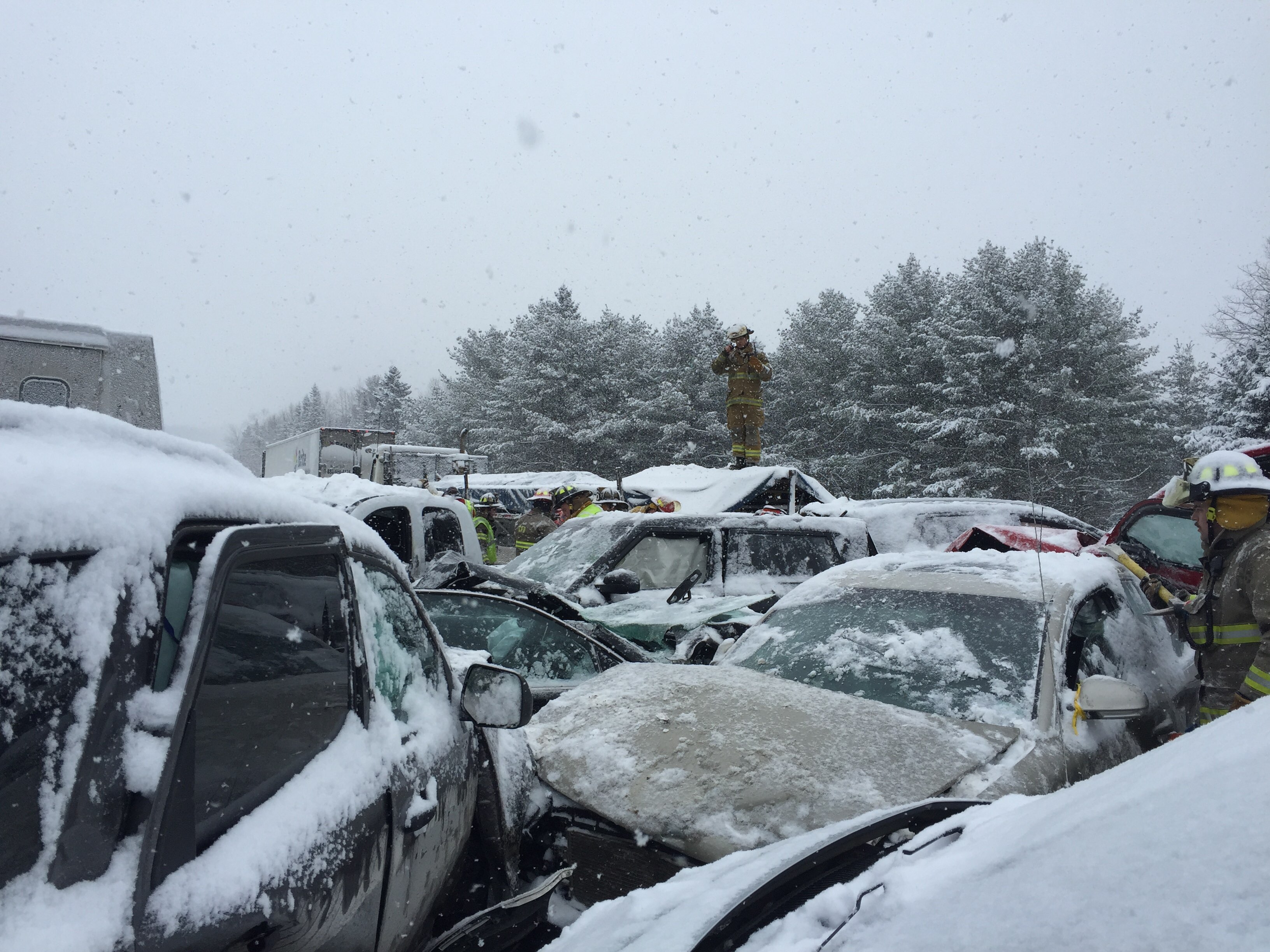 ETNA — More than 70 vehicles got tangled up in a series of chain-reaction pileups Wednesday along a snowy stretch of Interstate 95 in Maine, injuring at least 17 people, state police said.
