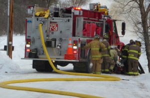 When Peru firefighters arrived, they broke through the brook ice, put a hose in and began pulling up water with a pumper/tanker truck and getting it to tankers farther up the road. A collapsible portable water pool was also set up about 100 yards from the fire.