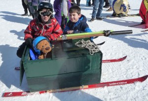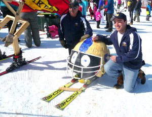 “Fearless 58,” a giant Mount Blue football helmet on skis made by father and son, Peter and Anthony Franchetti, won the Fastest Time, Longest Distance and Overall Winner awards. However, it didn’t even reach the jump, instead crashing into a lane wall halfway down the course.