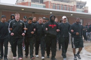 The Oklahoma football team decided to protest rather than practice on Monday. At the team’s indoor practice facility, coach Bob Stoops led the way as players, joined by athletic director Joe Castiglione, walked arm-in-arm, wearing black.