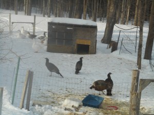 The turkeys — which I really like because they are just so different from any other bird, wild or domestic — seem to have found a home in my backyard and in the goose pen.