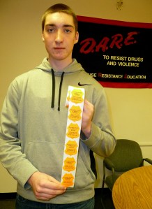 Hodsdon and officer Rob Drouin, Hodsdon’s wife, Renee, an Explorers adviser, and five Explorers spent Saturday placing six to eight rolls of stickers on beer cases and cases of flavored alcohol drinks such as Twisted Tea, in seven participating local stores.