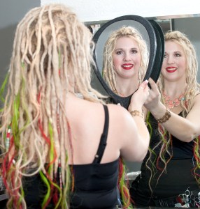 She’s friendly, quick to smile and she’s got a whirlwind of blond dreadlocks dancing down her back. For Christmas, she added green and red. She’s considering a follicular nod to spring next with purple, coral and green.