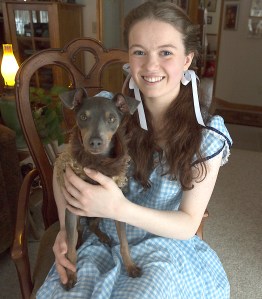 “He doesn’t look like Toto,” said his stage mother. Dash doesn’t have Toto’s fur. So Shannon made him a furry coat costume. And at 10 pounds, he’s the right size for Toto.