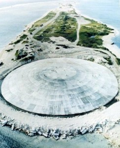 The atoll, part of the Marshall Islands, was the Cold War testing site for 43 hydrogen bombs between 1948 and 1958, which left mammoth craters that military engineers dumped sand, trees and the radioactive wreckage of ships into during the decontamination process, spending hundreds of millions of dollars. Eventually, engineers dumped it all inside a massive dome topped with concrete.