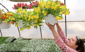 In the greenhouses are vegetable seedlings, tomato, basil, mint, cabbage and lettuce. There are hanging flower baskets, tables full of bright red geraniums, marigolds, asters, petunias and pansies. There wasn’t time this year to start perennials.