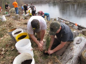 FARMINGTON — Many hands made quick work of planting 380 shrubs on the Sandy River erosion site along Whittier Road this week.