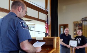 Board Chairman Greg Buccina handed the award to the youth while Police Chief Stacy Carter read a statement about Vincent’s good deed.
