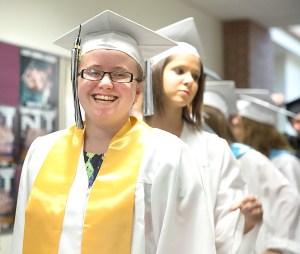 Principal Joline Girourard straightens another cap and the line keeps moving. Suddenly, a student in full robe comes dashing out of a bathroom and rushes to take his place in line.