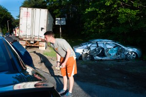 “It made one hell of a crash,” said James Lavertu of Oxford, an off-duty paramedic who had just walked into Shooter’s Pub when the vehicles collided. “When I came outside I thought, ‘Oh, this isn’t looking good.'”