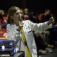 LEWISTON — Wearing her white coat, Jennifer Bergeron really grabbed the attention of 324 eighth graders Monday when she talked about handling lungs and brains in her Tufts University School of Medicine class.