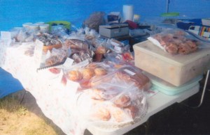 Food items include homemade whoopie pies, muffins, biscuits, whole pies, cakes, breads, donuts, cookies, jams and baked beans.