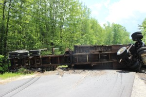 Several hundred feet of thick, black rubber traced the truck’s descent as Penfold apparently attempted to guide it backward. Where the road levelled off, the trailer apparently jack-knifed, causing the cab to rise in the air — narrowly missing a telephone pole — and slamming driver’s-side-down over both traffic lanes, Saunders said Oxford resident Phil Richardson told him.