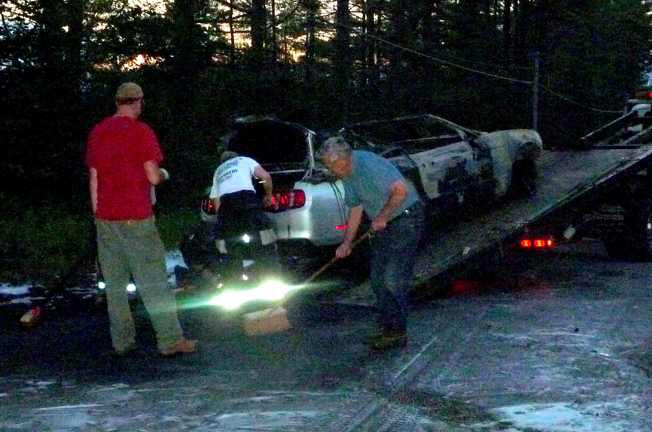 Four firefighters arrived at 7:17 p.m. in Engine 41 and four arrived in their personal vehicles. Tibbetts said that when he arrived, the Mustang was fully involved in fire in the middle of the road. They extinguished it using foam and cleaned up the mess. Adley’s Auto of Rumford sent a flatbed tow truck and winched the Mustang aboard.