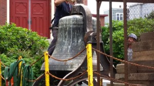 Workers removed the massive, 128-year-old bronze bell from the church bell tower Friday morning, inching it along a platform before connecting it to a crane and lowering it to a waiting flatbed truck.