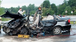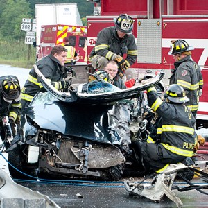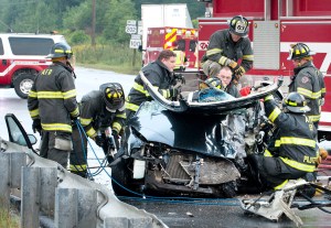 Firefighters used hydraulic equipment to free Michael Lahey, 54, from his mangled Kia Spectra after the 6:30 p.m. Wednesday crash sent the car spinning to the side of the road.