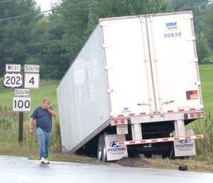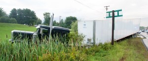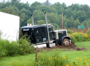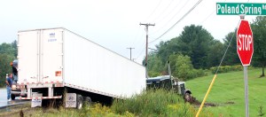The driver of the truck, Mark Andrews, 52, of New Gloucester, was not hurt, police said. After the collision, his rig crashed over an embankment and onto a lawn at the corner of Poland Spring Road, and one of its fuel tanks ruptured. Police notified the Maine Department of Environmental Protection of the potential for spilled fuel.