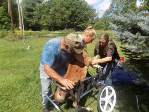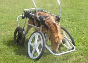 By Saturday morning, Angel Marie was more familiar with the wheelchair. In addition to making her way down slight inclines on the uneven lawn, the filly could also make her way back up small rises.
