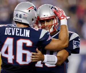 NOTES: The Patriots released five players: WR Josh Boyce, WR Jonathan Krause, TE Jimmay Mundine, DL Joe Vellano and LB Dekoda Watson. The roster must be at 75 on Tuesday and then to 53 Saturday. … Recently signed wide receiver Reggie Wayne says trying to catch up is “like (being) a rookie all over again — 36-year-old freshman.” Friday night, days after signing, he dropped the only pass thrown to him and ran the wrong route on another play. Talking about Tom Brady, absent from Monday’s walkthrough because he was in a New York court in the “Deflategate” case, Wayne said, “He’s awesome. He’s everything an outsider would see and think. For 14 years I’ve been on the other side of the ball. I’m looking at the way he operates and you say to yourself he’s got to be an A-1 quarterback. It looks like he does everything the right way, having fun, enjoying the game. You look at it from afar and you say those things and then when you’re on the same team it’s everything you thought.” … The Patriots host the New York Giants in the preseason finale Thursday night.