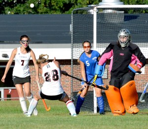 The teams largely played the first half between the 25-yard lines. Each goalie had one save, and each team took just two penalty corners. The Raiders cashed in on one of their two shots, though, when Erica Hannigan finished a tic-tac pass play from Veilleux at the left post.