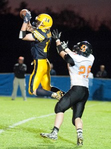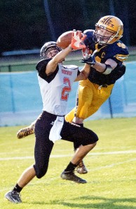 Mt. Blue countered on it’s next play when Pratt lofted a pass down the left sideline, where Nate Pratt-Holt made a sensational catch near midfield and outran Brewer to the end zone for an 80-yard strike. Christian Whitney booted the point after for a 7-6 advantage.