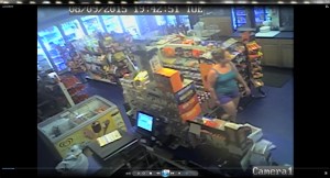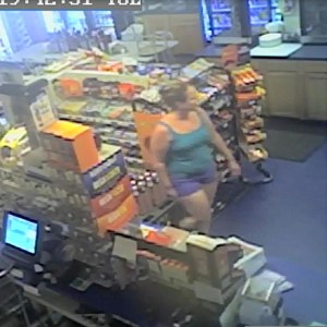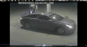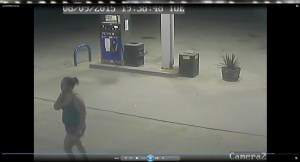 Video cameras at the gas station captured images of the woman and her car. She was wearing a blue tank top with purple shorts and appears to have dirty blond or brown hair worn in a bun. The car is a dark-colored, four-door sedan.