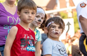 Caitlin’s brother, 6-year-old William, said his favorite sight on the city street was a fleet of lobster boats that handled swift figure-eight maneuvers as easily as any of the cycles, Crazy Cops cars or other mini-motorized vehicles. Caitlin said she liked the costumed Oriental Bands. Enjoying the show with Caitlin and William were their mom and dad, Jennifer and Michael Michaelis.