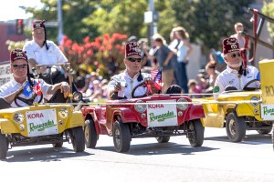 The Kora Temple displayed the largest motorized array. They sped around in small replicas of Crazy Cops cars, with old-time policemen chasing convicts in stripes who threw water at the lawmen, occasionally soaking a good-natured spectator.
