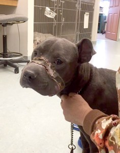 She said the damage to Blue’s muzzle was caused by his mouth being taped or tied shut for a long time.
