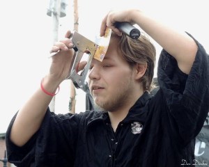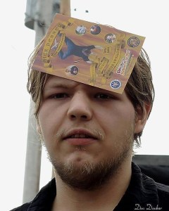 He has singed his eyebrows, however, while eating fire. To prevent that from happening again, he now has taken to stapling a card to his forehead to protect his eyebrows from the flames.