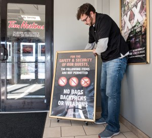 The large sign on a tripod outside the door that reads, in all capital letters, “No bags, backpacks or weapons,” is helping clear up confusion around the new law, which went into effect Thursday.