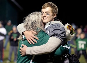 Seniors then lined up in the middle of the field to be recognized at their final regular-season home game. Smith, wearing a silver Leavitt football shirt, was introduced along with his mom, Sue, to the last and loudest round of applause.