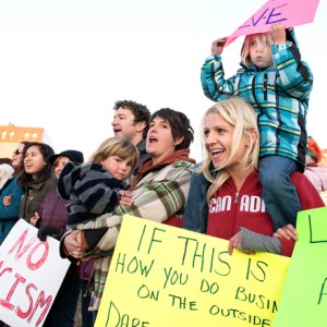 More video: Joe Dunne explains why his signs are personal, not racist.| Ben Chin talks about what the signs mean to him. | Rally gives people a chance to talk about hate in the community.