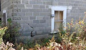 The entire westerly side of the building is cracked about seven feet high above the granite foundation. The crack runs up to the roof line through the eight-inch cinder blocks on either end. The side protrudes out and at least one block is jutting out at an angle.