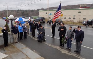 A wreath was laid at the base of each monument. At the Livermore Falls Memorial Bridge, the wreath was dropped into the Androscoggin River to remember veterans who served or were lost at sea.