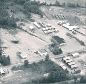 An aerial view of the Western Maine Supply building, center, with black roof, in the 1970s shows what is now known as the “snowman lot” to the left. The lot was the location of the Bethel town garage, the square building in center foreground.