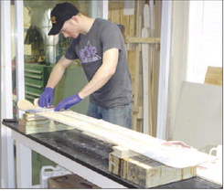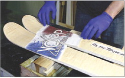 The top “sheet” of the ski is a thin layer of tiger maple, which shows up as a horizontal grain. After meticulous sanding of the finished skis, Bracy does the graphics, which he can tailor to the client’s preferences.