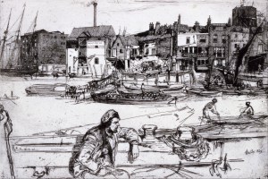 “Black Lion Wharf,” an outstanding etching created in 1859, is a poignant work depicting everyday life in a harbor and reproduced on the title page of the catalogue. Its incredible focus on detail and use of perspective is amazing. Whistler captures three different levels in the work: a wharf in the foreground with a man in a boat and equipment found around the wharf, a body of water in the middle of the work, and using perspective, takes the viewer to the other side of the harbor and a fishing village in the background.
