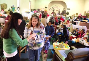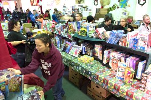 The Willsons provided their shoppers with a more serene experience than the pushes and shoves associated with the typical holiday retail shopping scene by admitting a half-dozen at a time. Volunteers were posted at every table to guide the shoppers who were allowed five new items to stuff into their complimentary garbage bags. Each shopper was given a ticket for every station in the large room, which features a snack bar stocked with free food and drinks. Out back, shoppers were entitled to 10 items from the thrift store that houses used clothing, toys and food staples.